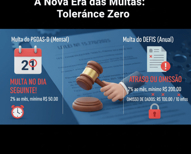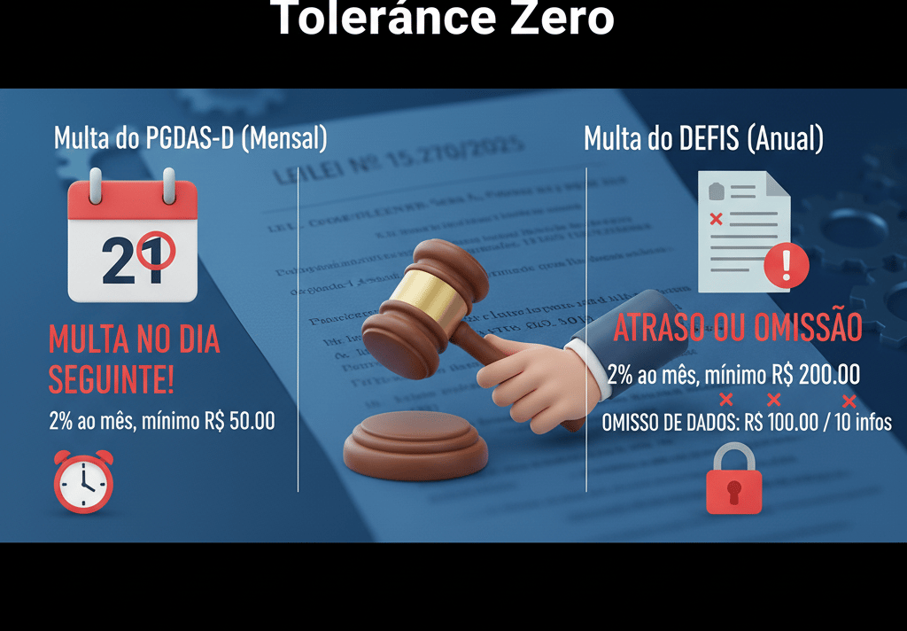 Multa do PGDAS-D (Mensal): Até 2025, a multa por atraso só começava a contar meses depois. Em 2026, a multa incide no dia seguinte ao vencimento (dia 21 de cada mês) com valor de 2% ao mês sobre o montante dos tributos informados, com valor mínimo de R$ 50,00.