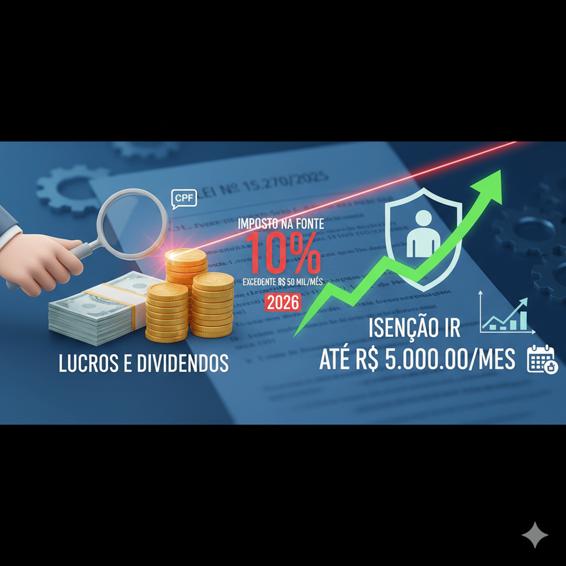 Taxação de Dividendos: A partir de 2026, haverá tributação na fonte de 10% sobre lucros e dividendos que excederem R$ 50 mil mensais por CPF.