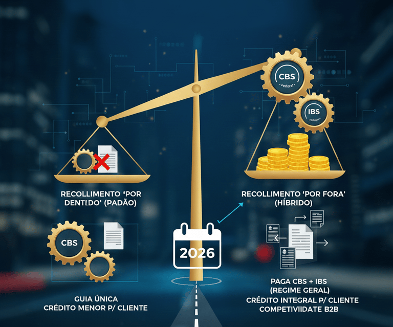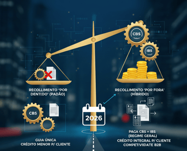 Modelo Híbrido: A grande vantagem de 2026 é poder escolher: se você vende para empresas (B2B), pode optar por pagar o IBS/CBS por fora e gerar crédito integral, mantendo a simplicidade do restante dos impostos no Simples.